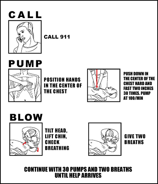 - - Expose the victims chest and begin chest compressions. 30 compressions, pressing down at least 2 inches at a rate of 100 per minute